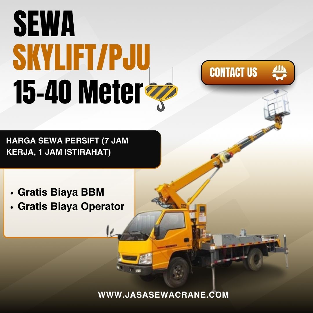 Alat angkat dengan keranjang untuk mengangkat pekerja ke ketinggian tertentu. Jangkauan 15 – 40 meter.